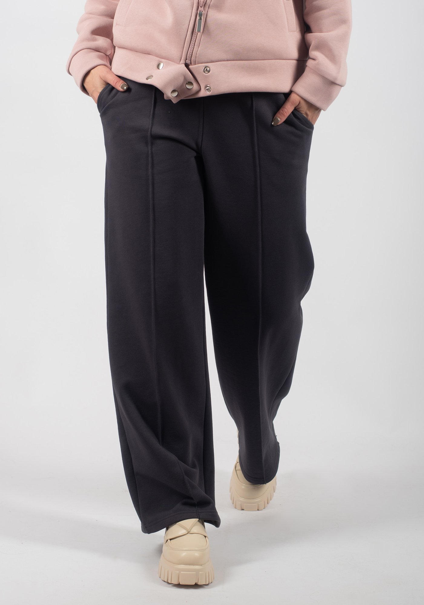 Стильные брюки палаццо со стрелками (защипами) выполненные из высококачественного турецкого футера 3-ех нитки без начеса. Стрелки защипы на брюках - это стильная и элегантная деталь, которая придает особый шик вашему образу. Трикотажные женские брюки свободного силуэта. На поясе удобная и широкая резинка со шнуром, два вместительных боковых кармана. Наша одежда свободного кроя - идеальное решение на каждый день. Такой крой даёт ощущение комфорта, свободы и раскованности. Наша актуальная модель будет прекрасным подарком на новый год, к 8 марта, день святого Валентина, на день рождение, на день матери. Сделано в России с любовью к Вам! Гладить с изнанки. Стирка при t не более 30С. Деликатный отжим, отбеливание запрещено. При соблюдении наших несложных правил ухода одежда DS будет радовать Вас долгое время!