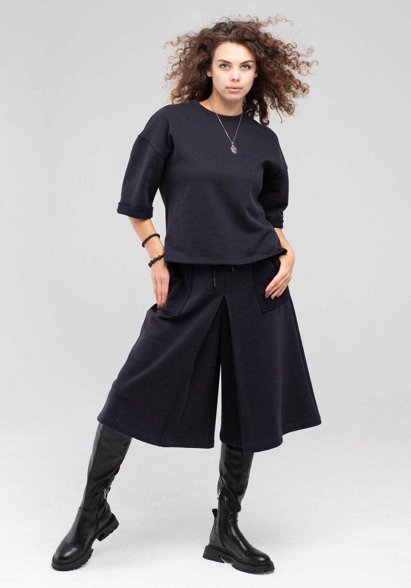 Стильные удобные кюлоты, выполненные из высококачественного турецкого футера 3-ех нитки без начеса. Кюлоты – укороченные широкие брюки до середины щиколотки, имитирующие юбку. На поясе удобная и широкая резинка со шнурами, два вместительных накладных кармана. Наша одежда свободного кроя - идеальное решение на каждый день. Такой крой даёт ощущение комфорта, свободы и раскованности. Эта шикарная актуальная модель будет прекрасным подарком на новый год, к 8 марта, день святого Валентина, на день рождение, на день матери. Кюлоты — любимая одежда представительниц королевских семей. Секрет этих брюк в том, что они подходят для любого случая. Сделано в России с любовью к Вам! Гладить с изнанки. Стирка при t не более 30С. Деликатный отжим, отбеливание запрещено. При соблюдении наших несложных правил ухода одежда DS будет радовать Вас долгое время!