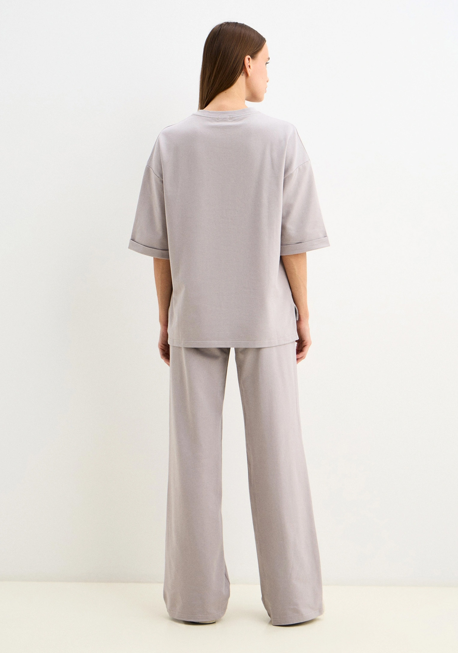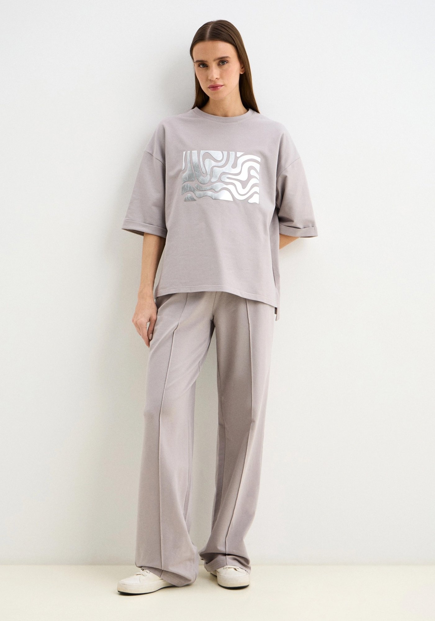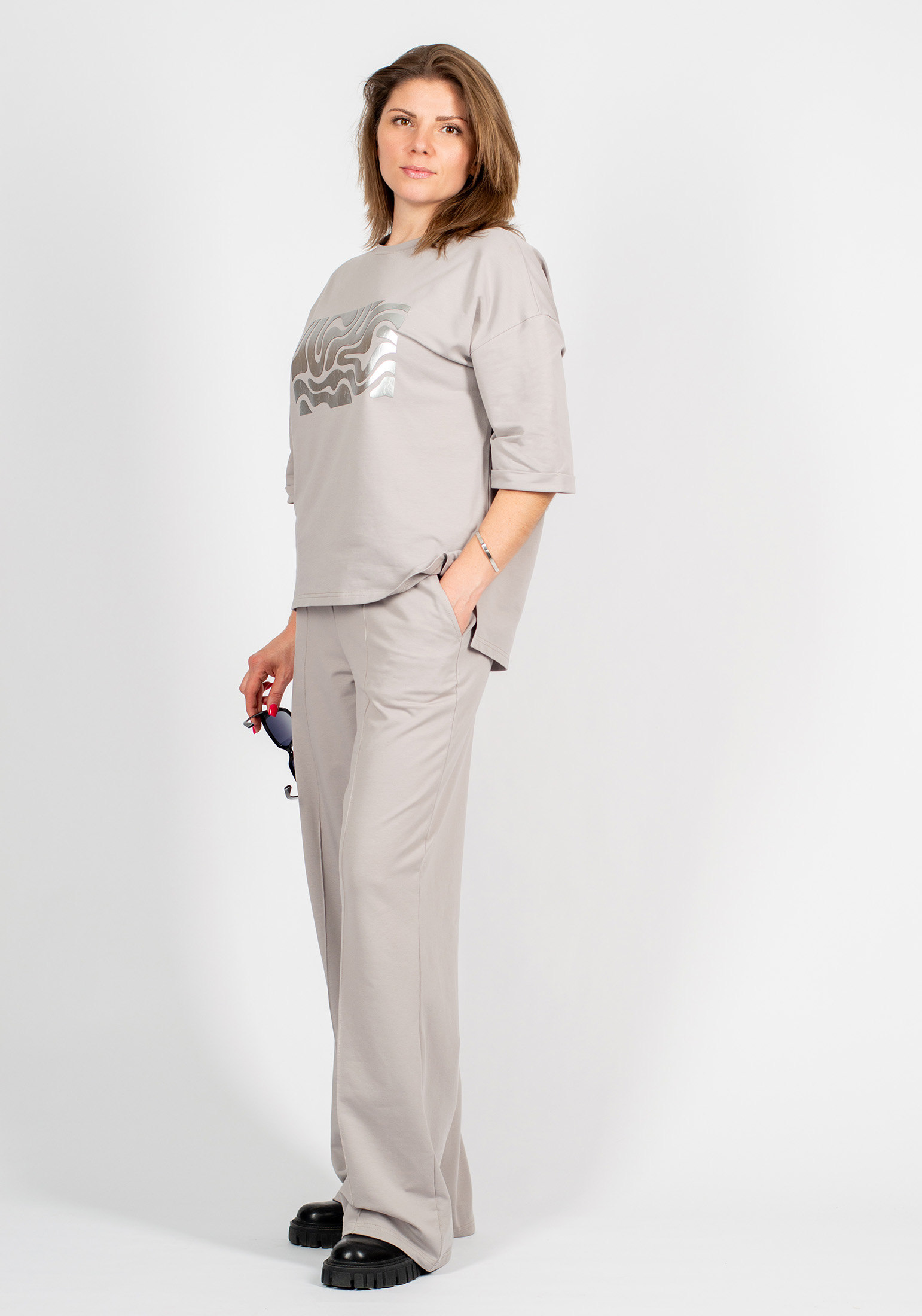 Стильный женский костюм, состоящий из брюк палаццо со стрелками (защипами) и джемпера с коротким рукавом, выполненный из высококачественного турецкого футера 2-х нитки. Оригинальный джемпер с коротким рукавом и круглым вырезом воротника. Элегантный образ создаётся за счёт разной длины спинки и полочки и разрезов в боковых швах. На полочке изделия шикарный принт с эффектом кожи. На рукавах отвороты, благодаря которым видно красивую фактуру футера. Стрелки защипы на брюках - это стильная и элегантная деталь, которая придает особый шик вашему образу. Трикотажные женские брюки свободного силуэта. На поясе удобная и широкая резинка, два вместительных боковых кармана. Наша одежда свободного кроя - идеальное решение на каждый день. Такой крой даёт ощущение комфорта, свободы и раскованности. Наша актуальная модель будет прекрасным подарком на новый год, к 8 марта, день святого Валентина, на день рождение, на день матери. Сделано в России с любовью к Вам! Гладить с изнанки. Стирка при t не более 30С. Деликатный отжим, отбеливание запрещено. При соблюдении наших несложных правил ухода одежда DS будет радовать Вас долгое время!