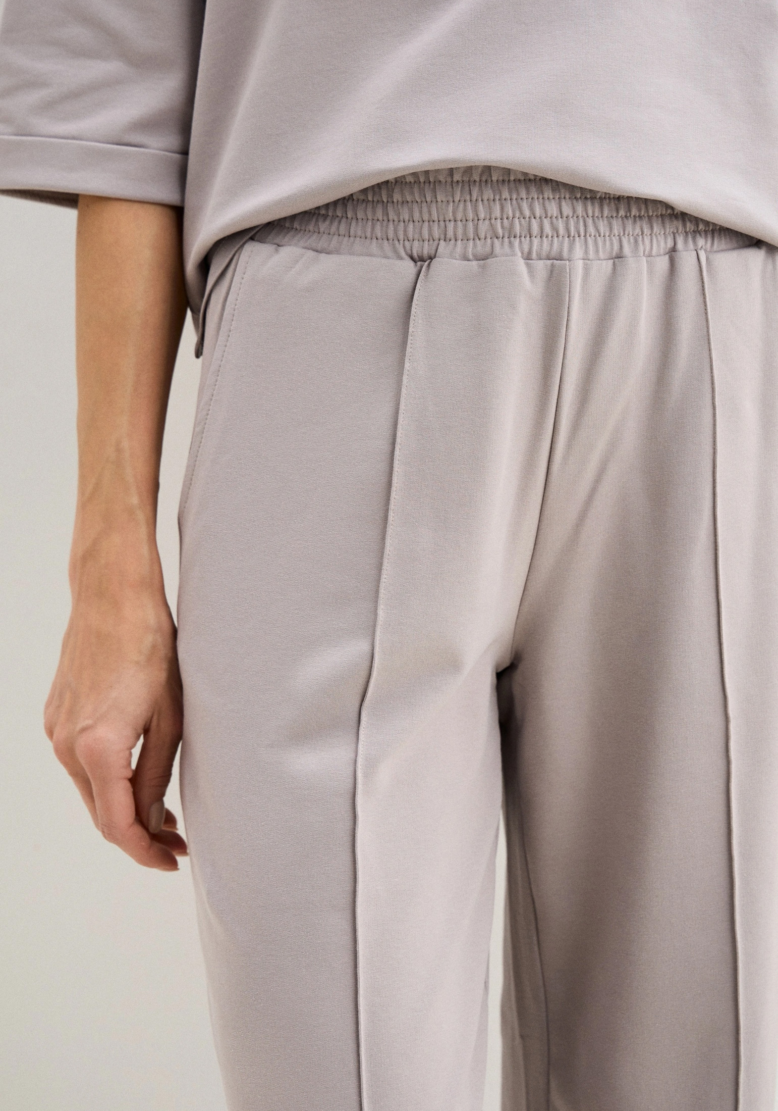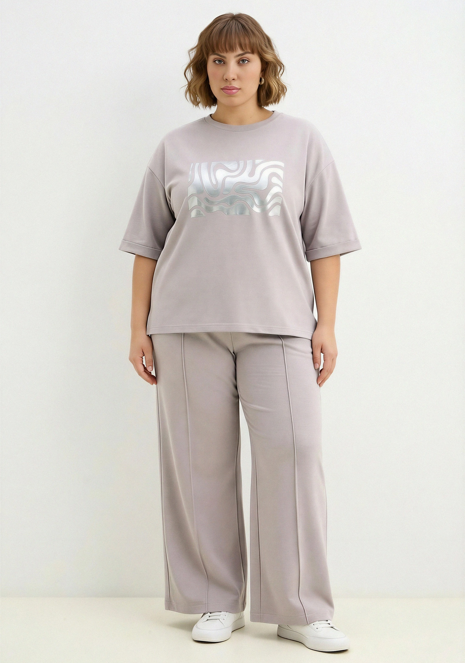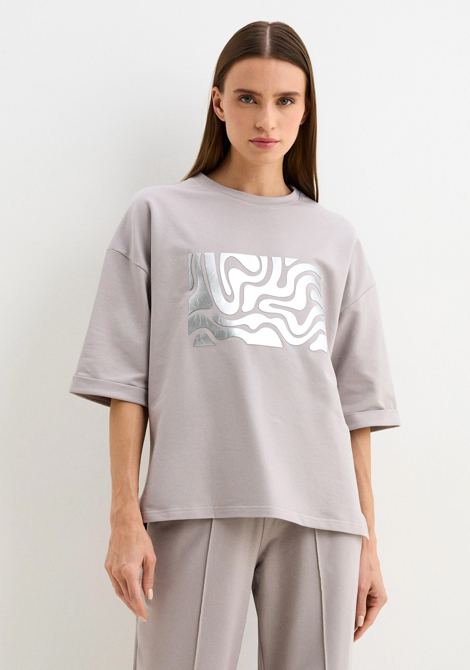 Стильный женский костюм, состоящий из брюк палаццо со стрелками (защипами) и джемпера с коротким рукавом, выполненный из высококачественного турецкого футера 2-х нитки. Оригинальный джемпер с коротким рукавом и круглым вырезом воротника. Элегантный образ создаётся за счёт разной длины спинки и полочки и разрезов в боковых швах. На полочке изделия шикарный принт с эффектом кожи. На рукавах отвороты, благодаря которым видно красивую фактуру футера. Стрелки защипы на брюках - это стильная и элегантная деталь, которая придает особый шик вашему образу. Трикотажные женские брюки свободного силуэта. На поясе удобная и широкая резинка, два вместительных боковых кармана. Наша одежда свободного кроя - идеальное решение на каждый день. Такой крой даёт ощущение комфорта, свободы и раскованности. Наша актуальная модель будет прекрасным подарком на новый год, к 8 марта, день святого Валентина, на день рождение, на день матери. Сделано в России с любовью к Вам! Гладить с изнанки. Стирка при t не более 30С. Деликатный отжим, отбеливание запрещено. При соблюдении наших несложных правил ухода одежда DS будет радовать Вас долгое время!