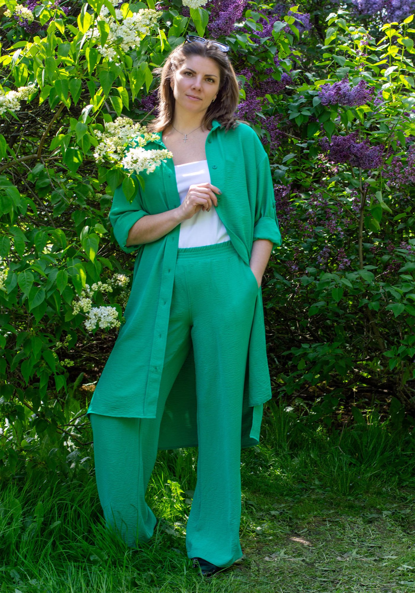 Летний женский костюм - идеальный выбор для стильных и модных девушек и женщин. Наш костюм состоит из брюк палаццо свободного силуэта и удлинённой рубашки с поясом. Комплект обладает оригинальным дизайном, изделия выполнены из текстильного жатого полотна дорна. Костюм ОВЕРСАЙЗ из легкой струящейся ткани - отличный вариант для повседневной носки, особенно в летнюю жаркую погоду. На поясе брюк удобная и широкая резинка, два вместительных функциональных боковых кармана. Легкие и свободные брюки палаццо универсальны, их можно носить на пляже, дома и на отдыхе, с рубашкой и с любым другим верхом: топом, майкой, футболкой, блузкой, кофтой. Рубашка оверсайз с пуговицами и прямые брюки на резинке создадут идеальный комплект для любого торжества. Так же комплект можно носить по раздельности, создавая множество стильных образов. Рубашку можно носить отдельно и с любым низом и как платье с поясом. Универсальный рукав длинный, но его легко трансформировать в рукав 3/4, благодаря удобной застежке. Рубашку можно носить как платье летнее или домашнее, так и как легкую накидку в прохладные вечера. Наша одежда свободного кроя - идеальное решение на каждый день. Такой крой даёт ощущение комфорта, свободы и раскованности - настоящая находка на жаркое лето! Отличный и незаменимый вариант повседневного гардероба, обеспечивающий свободу движений. Легкость, удобство, отличная воздухопроницаемость - все это делает нашу модель идеальным выбором! Удобный крой нашего костюма подойдет как для женщин и девушек с идеальными параметрами, так и для представительниц больших форм. Костюм прекрасно подойдет для дома, для отдыха на пляже, на море. Он будет идеален как пляжный вариант, благодаря легкой быстросохнущей ткани. Наша актуальная нарядная модель будет прекрасным подарком на новый год, к 8 марта, день святого Валентина, на день рождение, на день матери. Сделано в России с любовью к Вам! Гладить с изнанки. Стирка при t не более 30С, ткань после стирки дает небольшую усадку! Деликатный отжим, отбеливание запрещено. При соблюдении наших несложных правил ухода одежда DS будет радовать Вас долгое время!