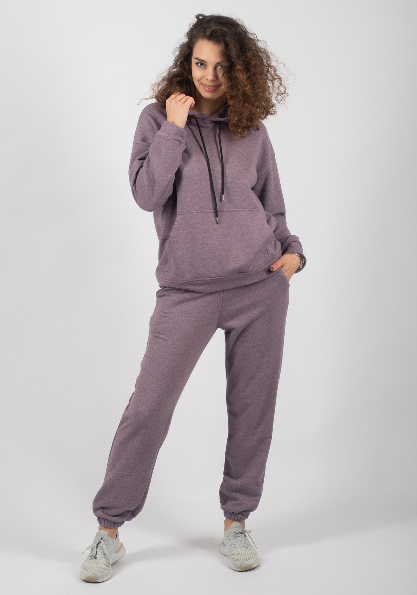 Стильный женский спортивный костюм выполнен из футера 3-ух нитки без начеса. В комплекте: худи и джоггеры из мягкого хлопка. На поясе брюк удобная и широкая резинка под шнуровку, что позволяет дополнительно регулировать изделие по объему, два боковых кармана. Худи свободного кроя, с удобным карманом «кенгуру». Модель без застёжки. Капюшон худи регулируется шнуром, несъемный. Эта универсальная модель подходит для повседневной носки, школы и спорта, на физкультуру, для активного отдыха, горнолыжного спорта, рыбалки, охоты и прогулок, туристических походов осенью, весной, зимой и холодными летними вечерами. Эффект оверсайз (OVERSIZE) достигается при выборе модели на размер больше. Трендовый дизайн делает наш костюм стильной частью повседневного женского гардероба! Наш актуальный костюм будет прекрасным подарком на новый год, к 8 марта, день святого Валентина, на день рождение, на день матери. Сделано в России с любовью к Вам! Гладить с изнанки. Стирка при t не более 30С. Деликатный отжим, отбеливание запрещено.