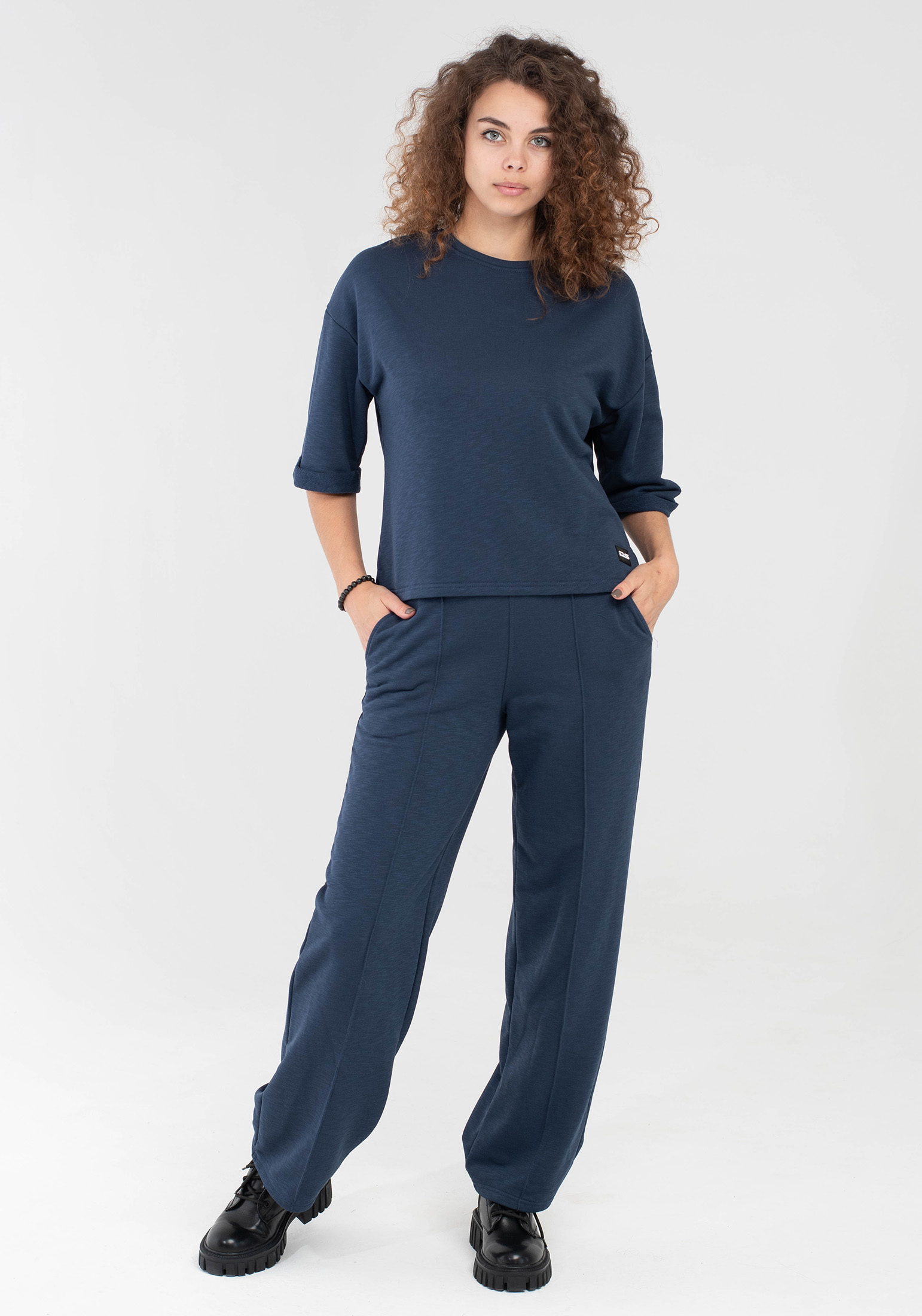 Стильный женский костюм, состоящий из брюк палаццо со стрелками (защипами) и джемпера с коротким рукавом, выполненный из высококачественного турецкого футера 3-ех нитки без начеса с эффектом Paris Slab. Оригинальный джемпер с коротким рукавом и круглым вырезом воротника. Элегантный образ создаётся за счёт разной длины спинки и полочки и разрезов в боковых швах. На рукавах отвороты, благодаря которым видно красивую фактуру футера. Стрелки защипы на брюках - это стильная и элегантная деталь, которая придает особый шик вашему образу. Трикотажные женские брюки свободного силуэта. На поясе удобная и широкая резинка, два вместительных боковых кармана. Наша одежда свободного кроя - идеальное решение на каждый день. Такой крой даёт ощущение комфорта, свободы и раскованности. Наша актуальная модель будет прекрасным подарком на новый год, к 8 марта, день святого Валентина, на день рождение, на день матери. Сделано в России с любовью к Вам! Гладить с изнанки. Стирка при t не более 30С. Деликатный отжим, отбеливание запрещено. При соблюдении наших несложных правил ухода одежда DS будет радовать Вас долгое время!