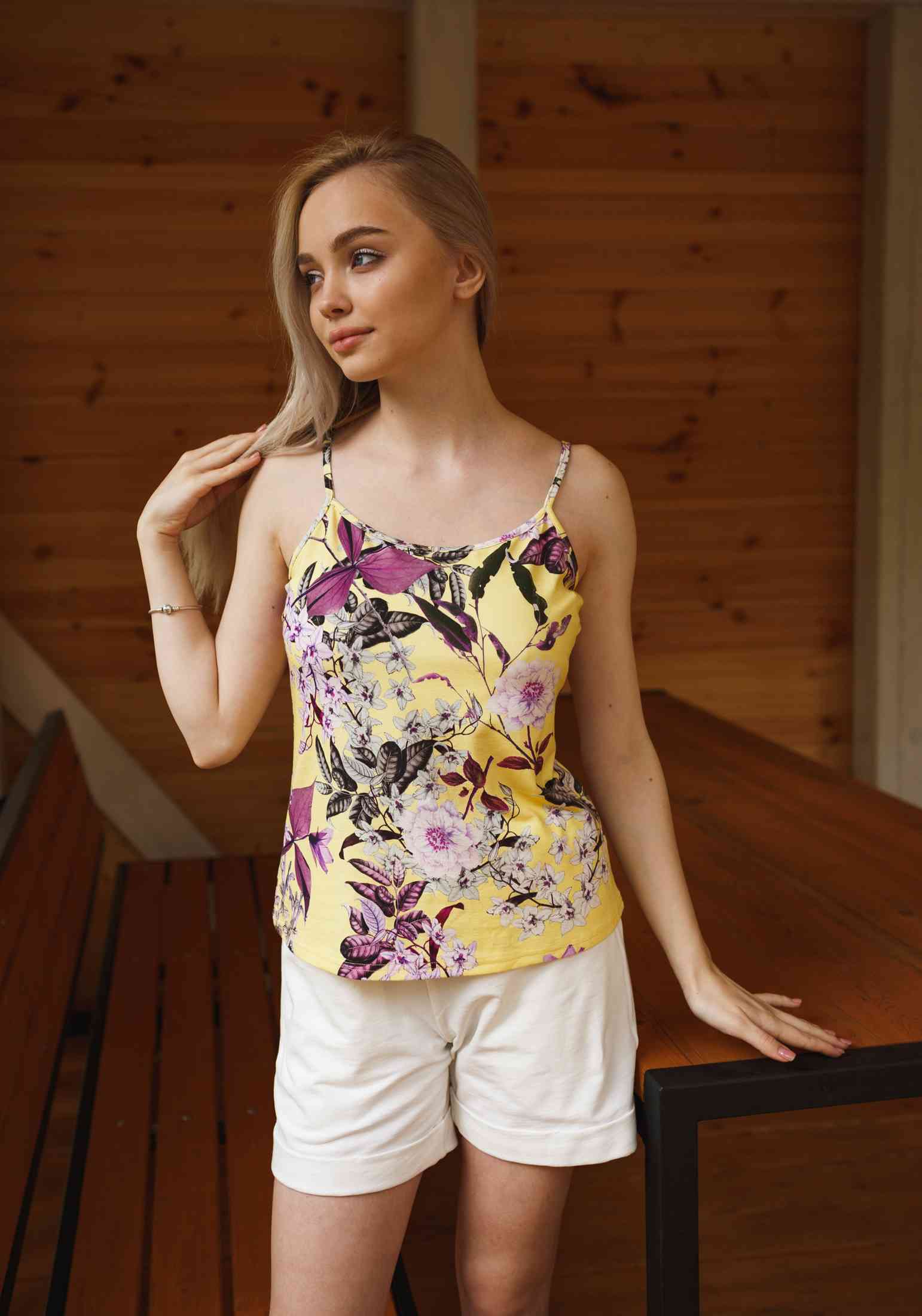 Женский топ на брителях, выполнен из лёгкой вискозной ткани различных оттенков. Изделие очень мягкое и комфортное в носке. Данная модель отлично сочетается с различными предметами одежды, будь то джинсы, классические брюки, шорты или юбка. А летний цветочный рисунок придаст вашему образу яркости и индивидуальности. Гладить с изнанки. Стирка при t не более 30С. Деликатный отжим, отбеливание запрещено.